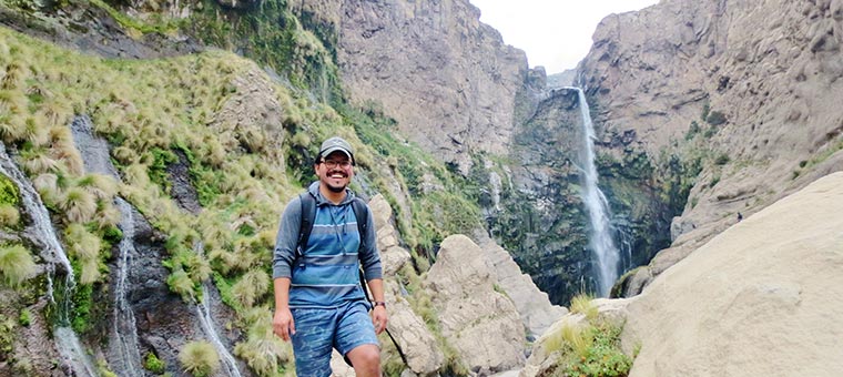 Desde este punto, iniciamos el descenso del cerro a mas de 4000 msnm, durante hora y media de trekk por un camino de herradura (ida), hasta llegar a la hermosa catarata de aguas cristalinas y con una impresionante y alta caída de agua. Aquellos que se armen de valor y quieren experimentar podrán refrescarse en sus aguas, las cuales son muy frías.